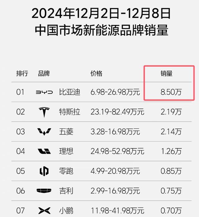 12月2号-8号,国内的新动力汽车品牌销量排名榜出来了,其中比亚迪的海洋网+王朝网加起来,累计的周销量达到了8.5万台,看起来真的比不上10月份单周销量蹂躏9.5万台那么厉害,关联词比亚迪的两大高端子品牌都有庞杂惊喜: