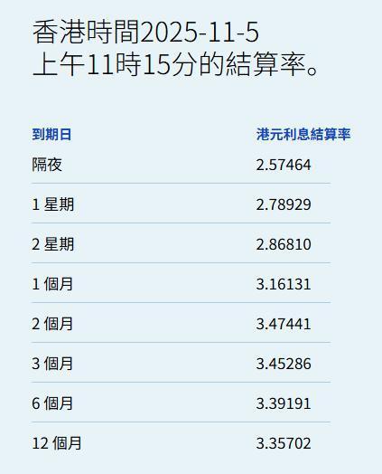 智通财经APP获悉,11月5日,港元拆息全线下降,隔夜息报2.57464%,跌22.227基点;一周拆息跌28.702基点,报2.78929%,两周则跌26.154基点开yun体育网,报2.8681%。与楼按联系的一个月拆息连跌三日报3.16131%,跌15.369基点,见八周低位。